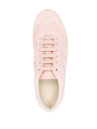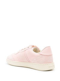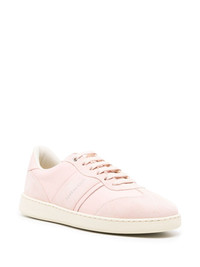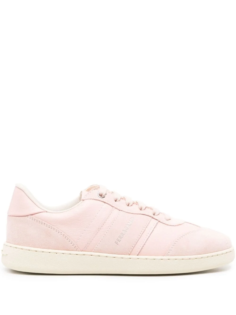 debossed-logo suede-leather trainers Ferragamo's sneakers are defined by their signature details. Crafted from light pink leather, they're embellished with Gancini eyelets and an engraved logo to the side. Highlights - Light pink - Suede - Calf leather - Cracked texture - Panelled design - Debossed logo to the side - Logo-debossed tongue - Logo at the sole - Front lace-up fastening - Mesh lining - Branded leather insole - Rubber outsole Made in Italy Composition Suede 100% SIZE & FIT Measurement HEEL 0.98 in(2.5 cm) Sole height 0.59 in(1.5 cm)