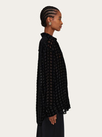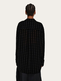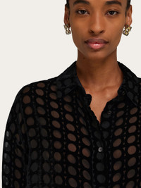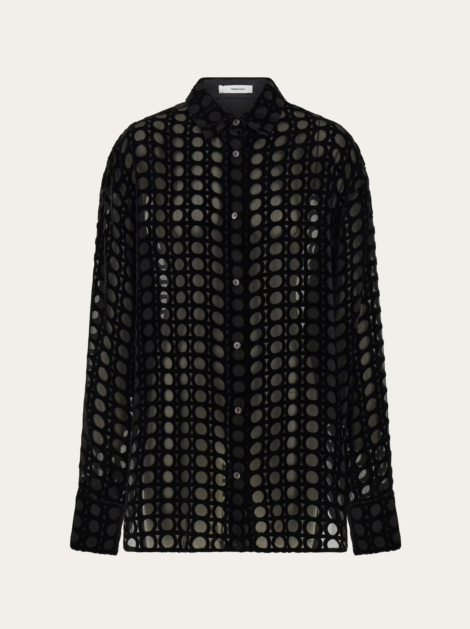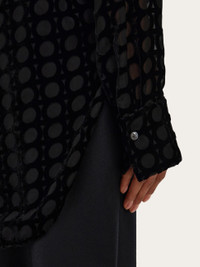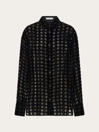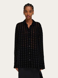 Lit up by rows of Gancio silhouettes with transparent details, this button up shirt is cut from pure silk with a touch of viscose. The devore effect confirms a contemporary edge, echoed by the relaxed fit and rounded bottom hem. - Composition: 82% silk, 18% viscose - Model measurements: Height 5' 9"/175 cm; Bust 30"/76 cm; Waist 24"/61 cm; Hips 34½"/87 cm - Model wearing: 38/XS - Made in ITALY - Product code: 13H026 782997