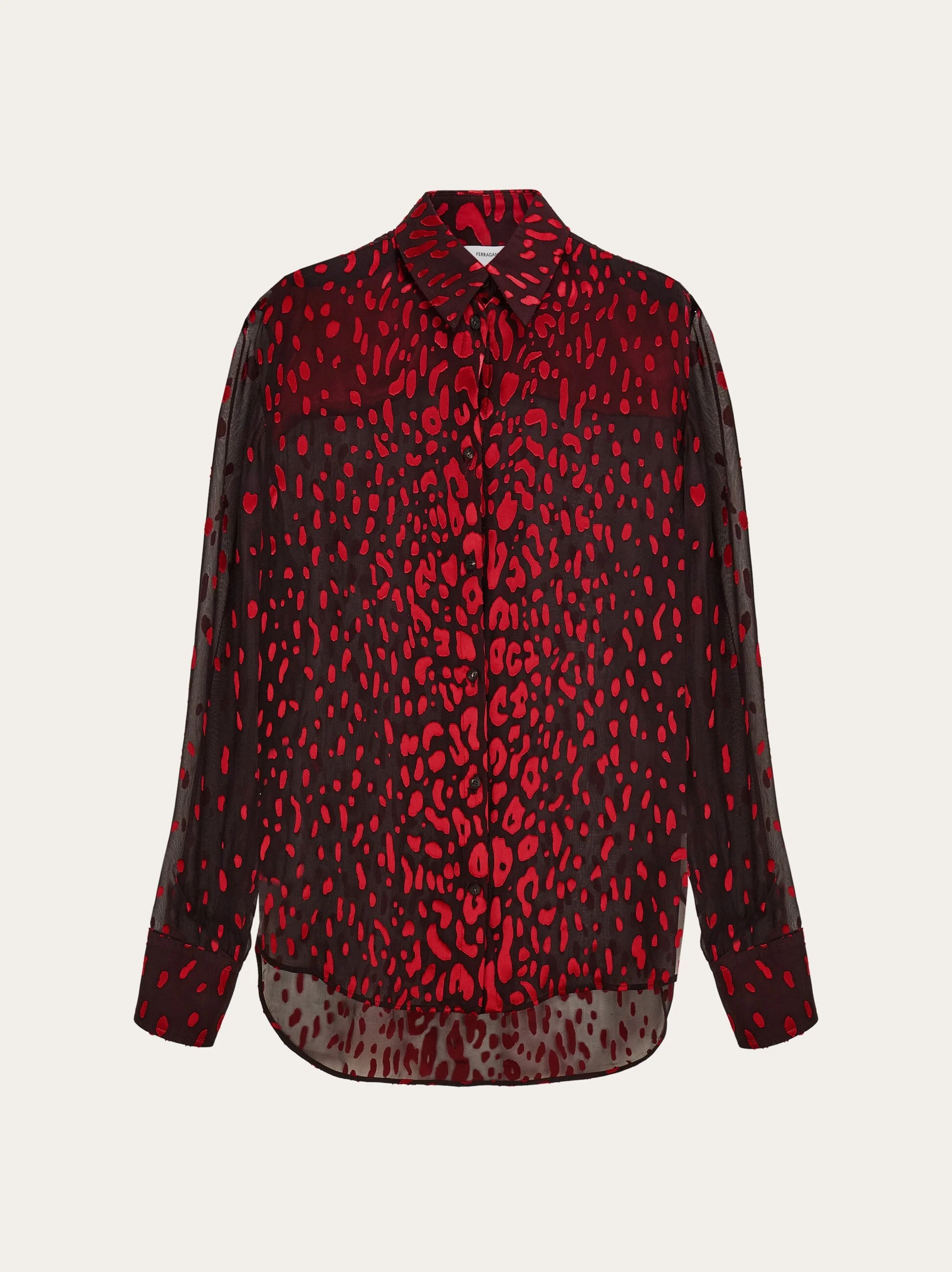 Devore: a luxurious texture made by dissolving certain fibers to leave a semi-transparent design. This silk georgette shirt is adorned with an animal-like devore patten that features throughout the collection. Delicate and sheer, the rounded hem can be worn tucked in or out of trousers and skirts. - Composition: 36% viscose, 64% silk - Made in ITALY - Product code: 13I461 794181