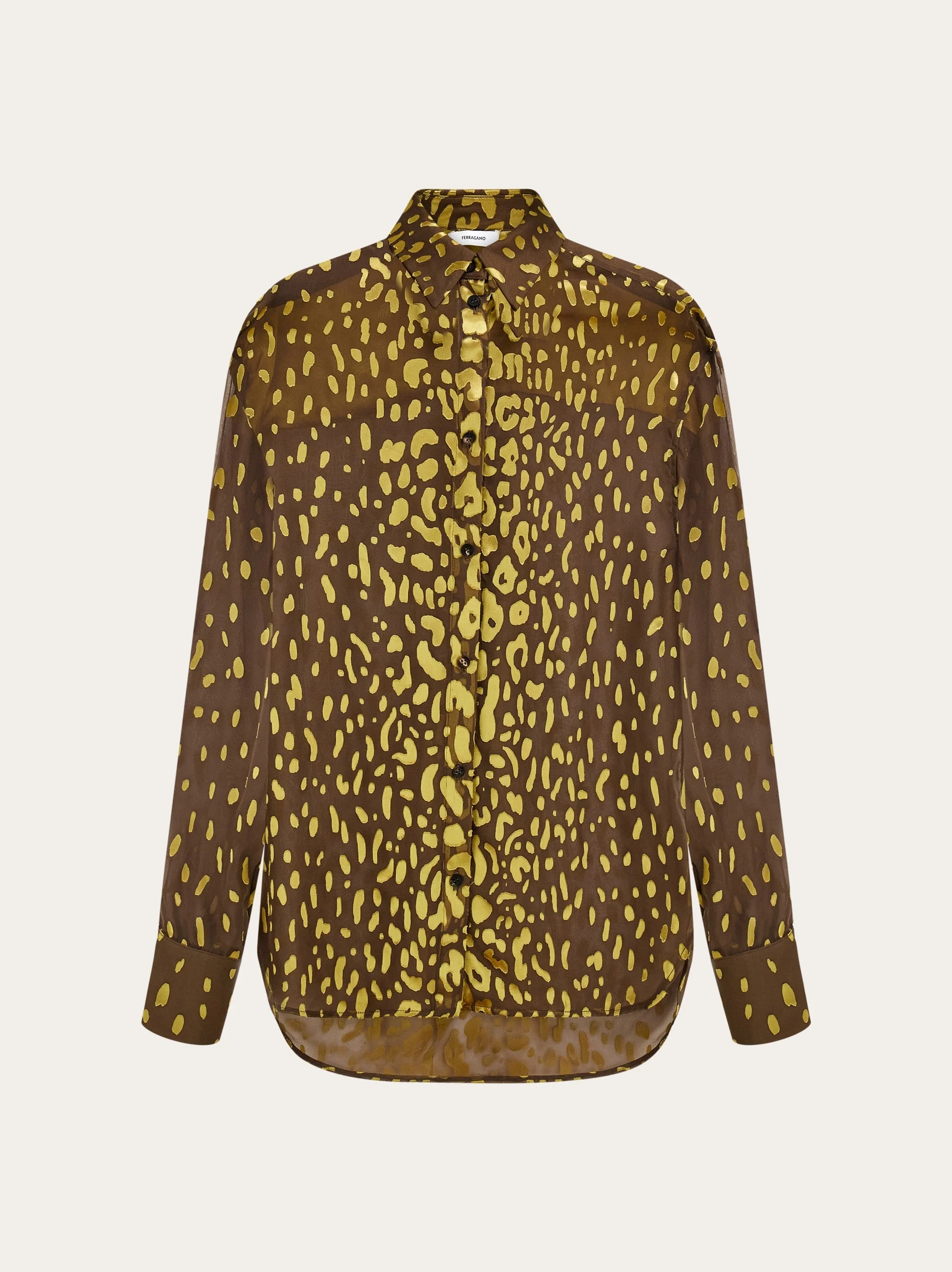 Devore: a luxurious texture made by dissolving certain fibers to leave a semi-transparent design. This silk georgette shirt is adorned with an animal-like devore patten that features throughout the collection. Delicate and sheer, the rounded hem can be worn tucked in or out of trousers and skirts. - Composition: 36% viscose, 64% silk - Made in ITALY - Product code: 13I461 793946