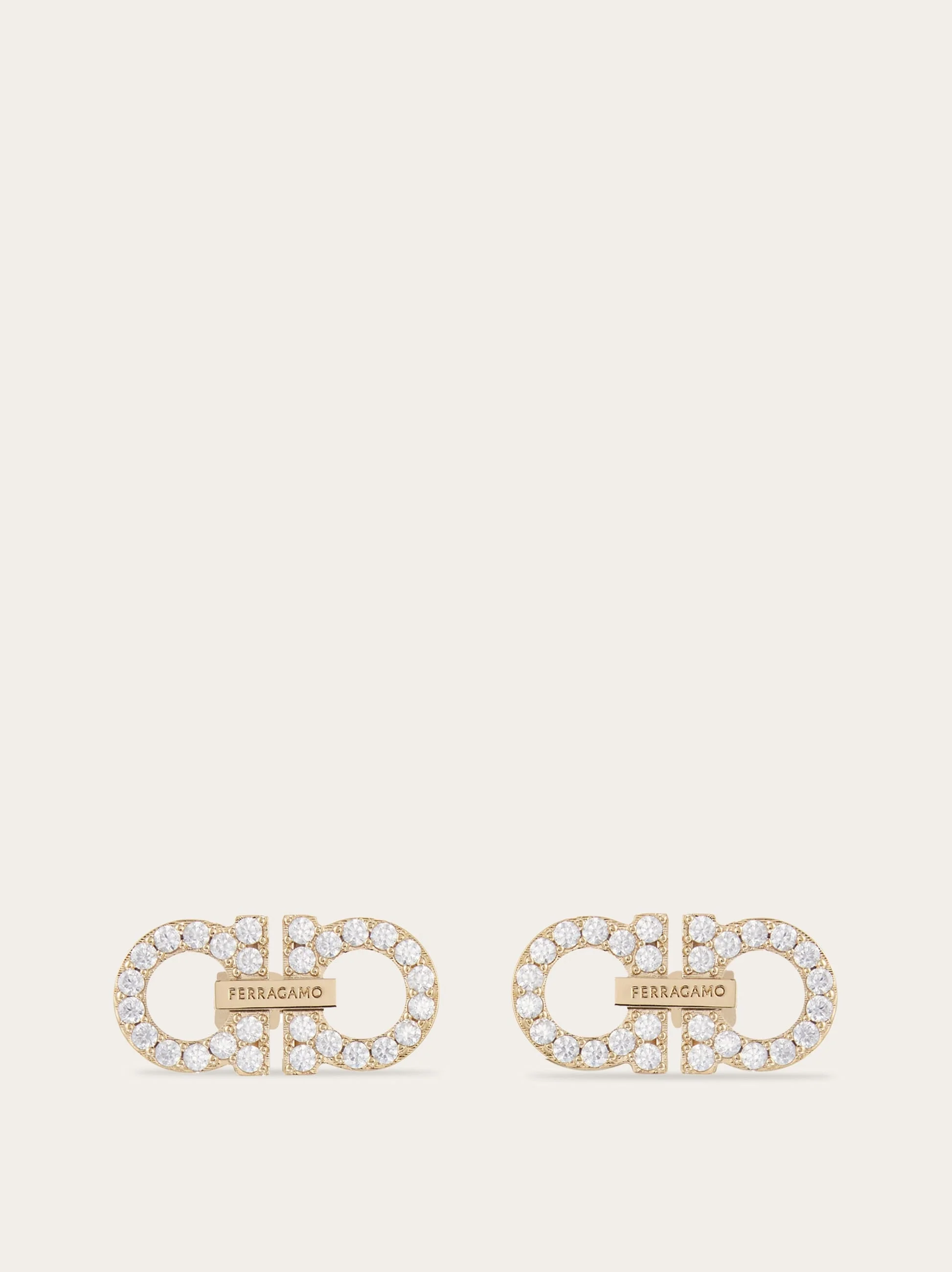 Two simple back to back Gancios make up the outline of these crystal embellished gold-tone earrings. A tiny rectangular piece with engraved signature holds them together. - Composition: brass and crystals - Made in ITALY - Product code: 760871 785180