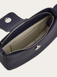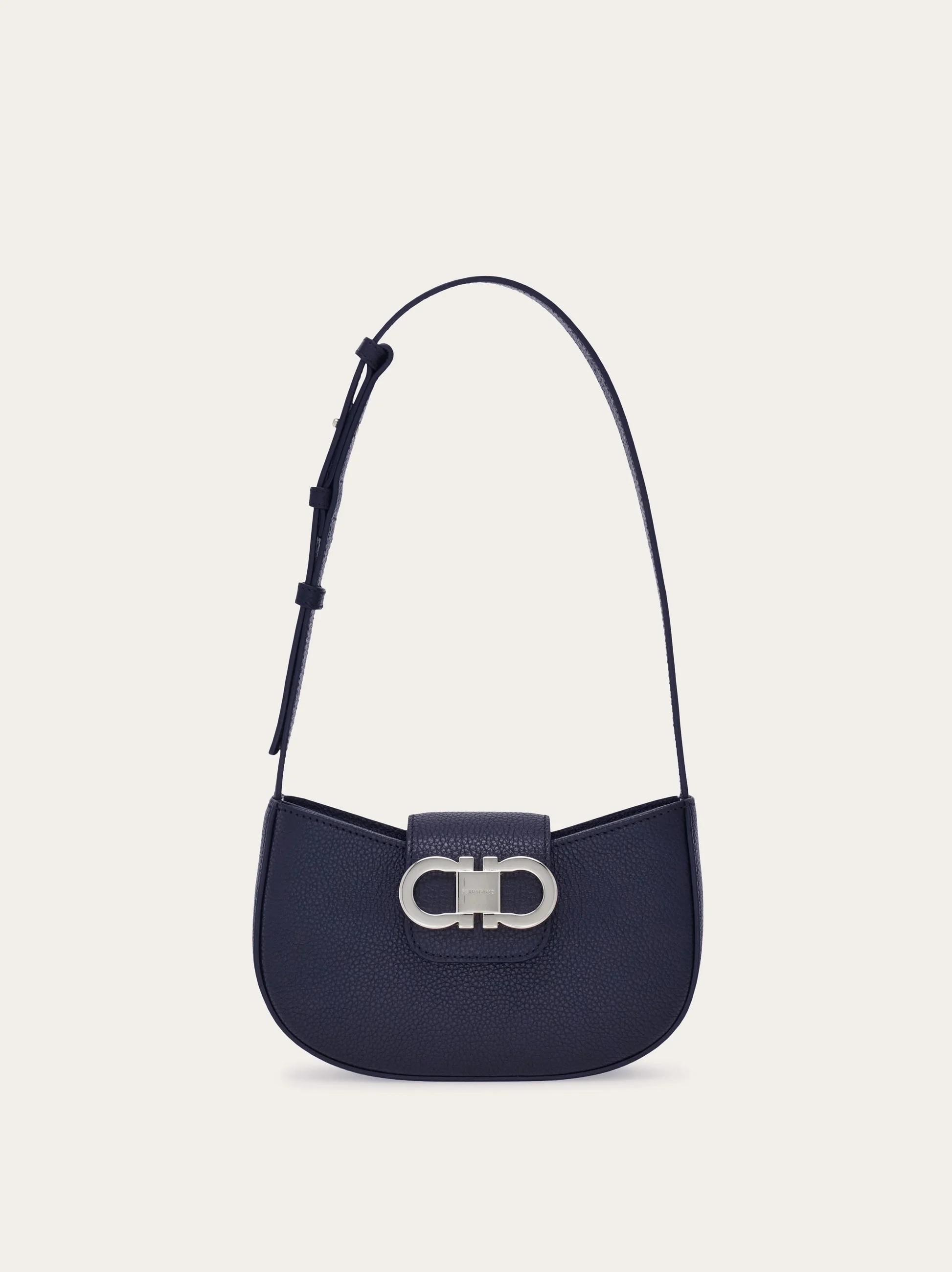 Effortless elegance in a compact form, this new mini bag showcases gently rounded edges, a zip closure, and a top bridge accented with a signature Gancini detail. The leather-lined interior features dedicated slots for cards and documents, while the adjustable strap allows for refined shoulder styling. - height 4.5 IN length 7.8 IN width 2.1 IN - Composition: hammered calfskin - Mini - Made in ITALY - Product code: 220947 785943
