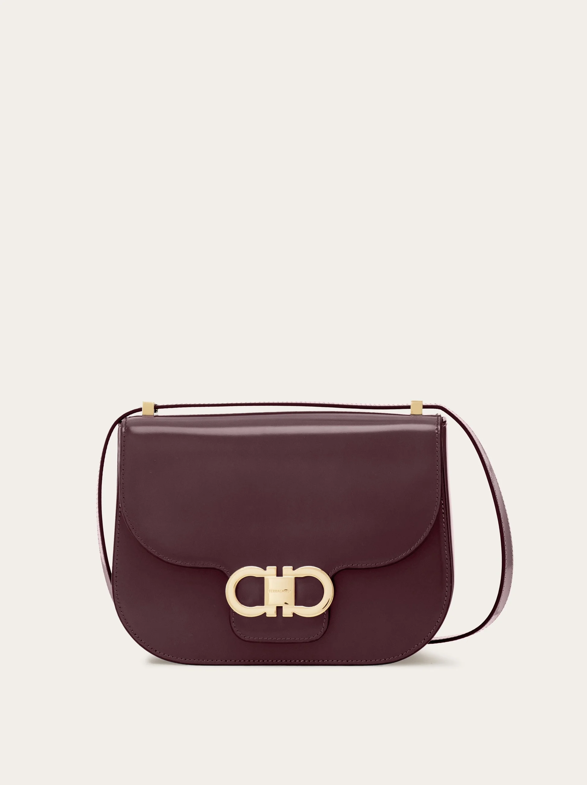 A ladylike silhouette with a contemporary attitude, this versatile Ferragamo crossbody will elevate any outfit. Cut from hammered calfskin leather, it features a curved front flap that fastens at the front via a golden Gancini clasp. A slit pocket on the back and well organized interior provide ample space for personal effects, and the adjustable shoulder strap is perfect for hands-free styling. - A) Height 6.6 IN B) Length 8.4 IN C) Width 2.7 IN - Composition: calfskin - Handle drop: 19.7 in/50 cm - Extra small - Made in ITALY - Product code: 219867 789542