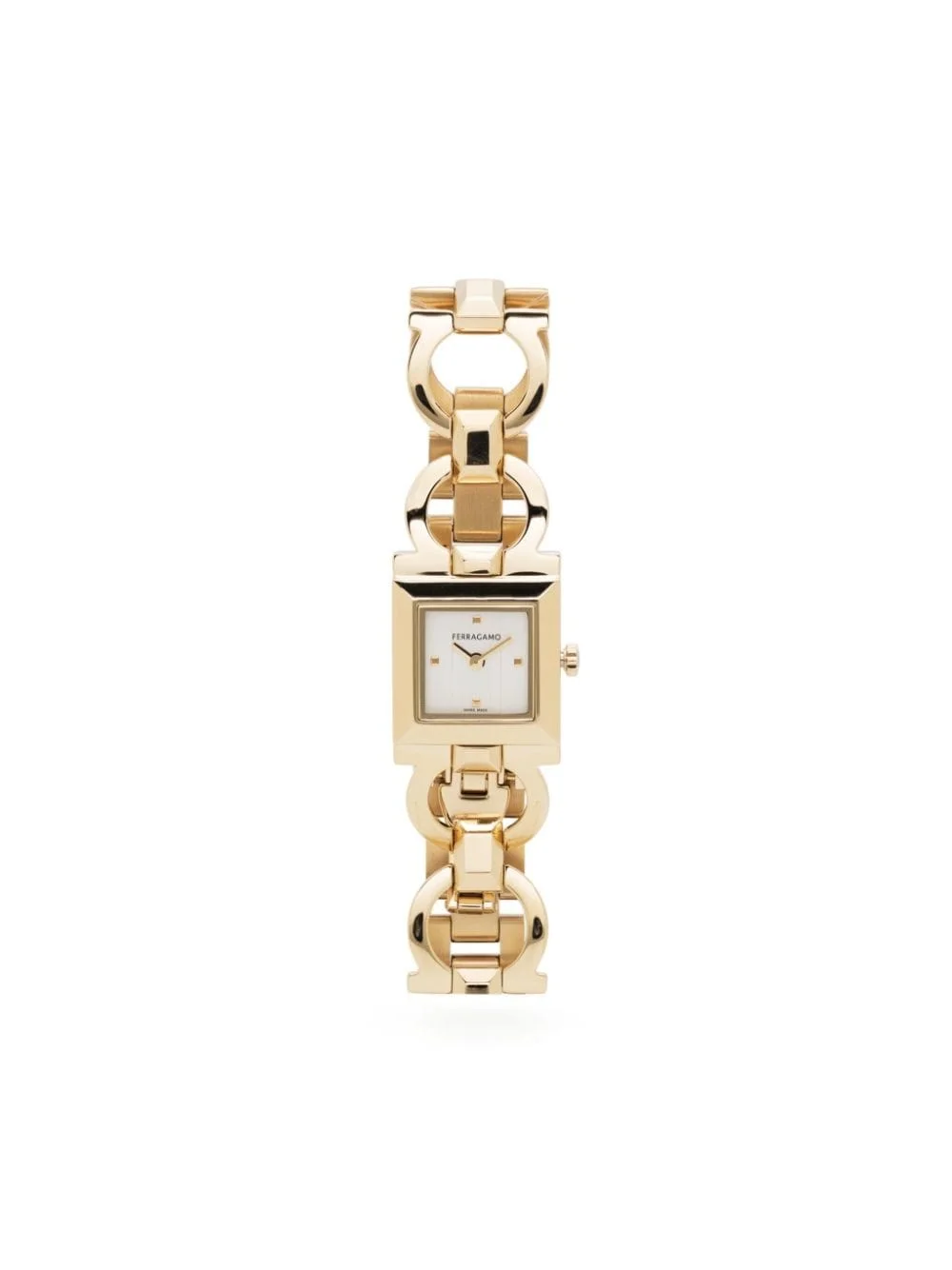 Double Gancini square watch Ferragamo's Double Gancini Square is a re-edition of the brand's iconic collection, boasting the signature motif. Crafted from polished gold-toned stainless steel, it's powered by a Swiss Quartz movement for precision. Highlights - Gold-tone - Stainless steel - Sapphire - Gancini plaque - Polished finish - Sunray-patterned dial - Deployant-clasp fastening - Quartz movement Imported SIZE & FIT Measurement CIRCUMFERENCE 7.67 in(19.5 cm) DIAMETER 0.78 in(2 cm) Thickness 0.47 in(1.2 cm) WIDTH 0.78 in(2 cm)