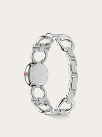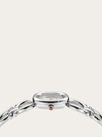 Among Ferragamo's best-selling watches, the Double Gancini style is reimagined as a stunning jewellery piece. The slightly rounded case features a raised outline that echoes the iconic motif of the bracelet, enhancing the sense of elegance and individuality. Size: 25 mm Movement: RONDA 751.2 - 2 hands quartz Case: Stainless steel - Crown with red cabochon Dial: White silver sunray Bracelet: Stainless steel double Gancini bracelet - Jewelry buckle with Ferragamo logo Glass: Sapphire crystal anti-reflection, scratch-resistant WaterResistance: 50 meters 2+2 Year Warranty Outer box, packaging, warranty and instruction booklet - Composition: Stainless steel case and bracelet - Made in SWISS - Product code: 611314 778130