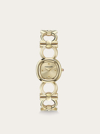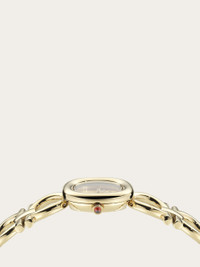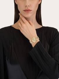 Among Ferragamo's best-selling watches, the Double Gancini style is reimagined as a stunning jewellery piece. The slightly rounded case features a raised outline that echoes the iconic motif of the bracelet, enhancing the sense of elegance and individuality. Size: 25 mm Movement: RONDA 751.2 - 2 hands quartz Case: IP yellow gold case - Crown with red cabochon Dial: Yellow gold sunray Bracelet: IP yellow gold double Gancini Bracelet - Jewelry buckle with Ferragamo logo Glass: Sapphire crystal anti-reflection, scratch-resistant WaterResistance: 50 meters 2+2 Year Warranty Outer box, packaging, warranty and instruction booklet - Composition: Stainless steel and IP yellow gold case and bracelet - Made in SWISS - Product code: 611314 778131