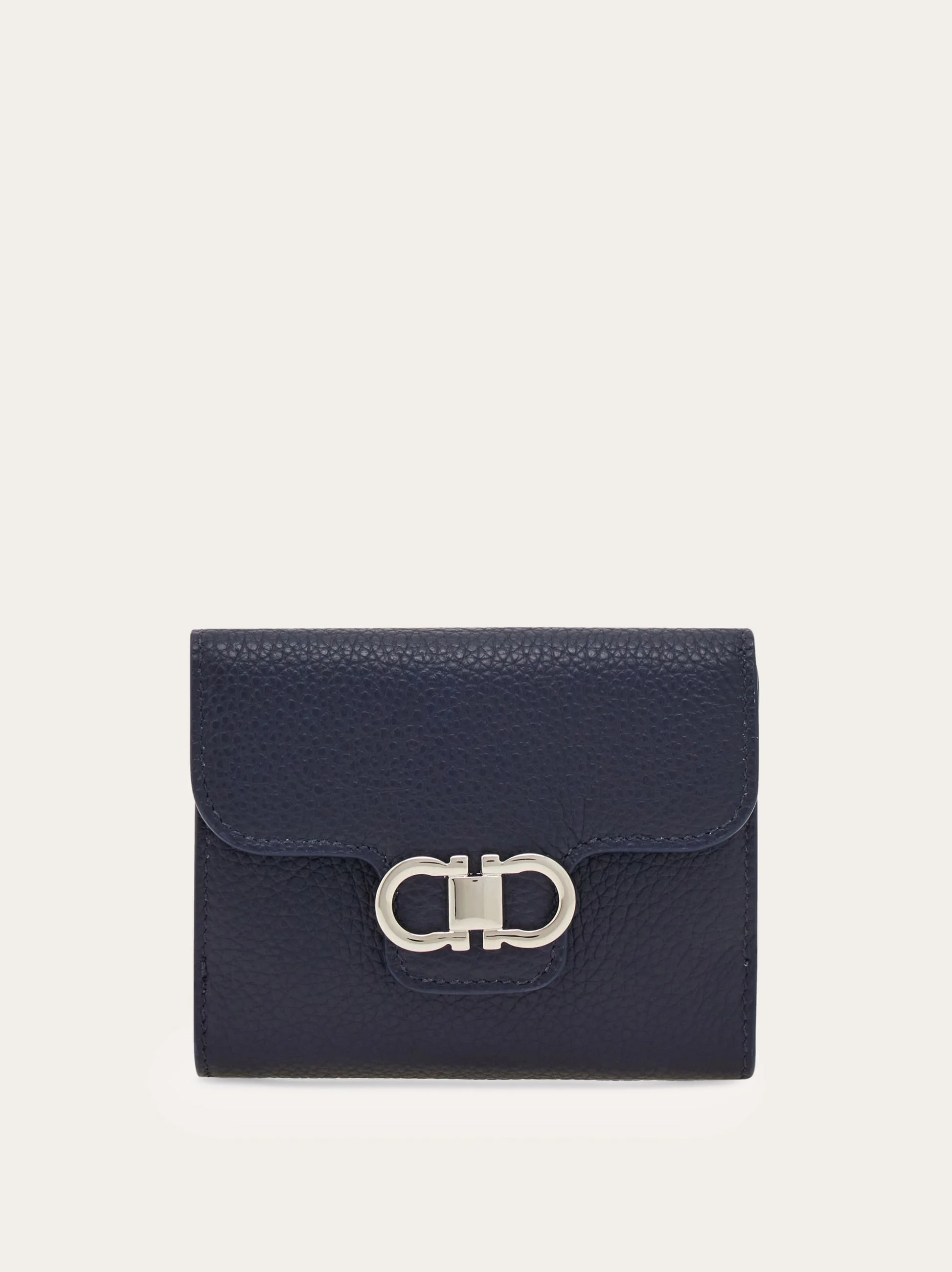 Compact and versatile, this French wallet features a grained calfskin exterior and a smooth, contrast-color interior. Designed for effortless organization, it includes flat pockets, a bill compartment, and an external coin pocket with a snap closure. The front flap is elegantly finished with a double Gancini buckle and a sleek square center plate. - height 3.5 IN length 4.3 IN width 1.1 IN - Composition: hammered calfskin - Made in ITALY - Product code: 220961 785780