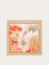 An exotic landscape, with sand dunes, palm trees and multi-coloured butterflies decorates this pure silk scarf. The stylized moon and the play of light and shade defined by the Ferragamo Monogram give life to a dreamlike setting, with a hand-stitched edge and logo printed on the edge. - length 35.4 IN width 35.4 IN - Composition: 100% silk - Made in ITALY - Product code: 310215 785337