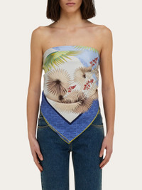 An exotic landscape, with sand dunes, palm trees and multi-coloured butterflies decorates this pure silk scarf. The stylized moon and the play of light and shade defined by the Ferragamo Monogram give life to a dreamlike setting, with a hand-stitched edge and logo printed on the edge. - length 35.4 IN width 35.4 IN - Composition: 100% silk - Made in ITALY - Product code: 310215 785335