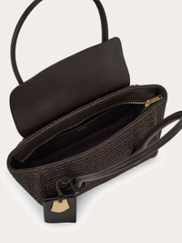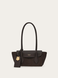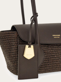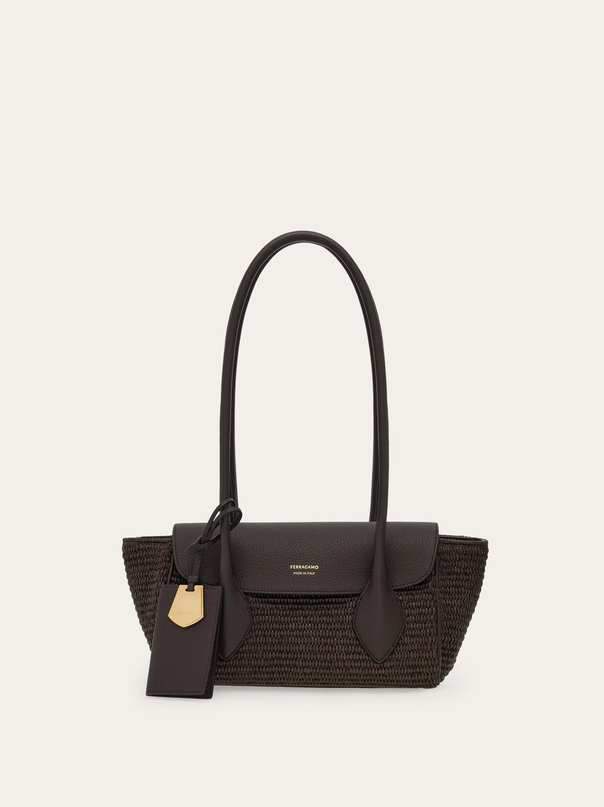 The savvy blend of leather and raffia brings to life this East-West tote. A chic card holder with metallic charm dangles from the extra-long tonal top handle, which complements the raffia panels. - A) Height 5.9 IN B) Length 9.8 IN C) Width 5.1 IN - Composition: raffia and calfskin - Small - Made in ITALY - Product code: 21A209 783824