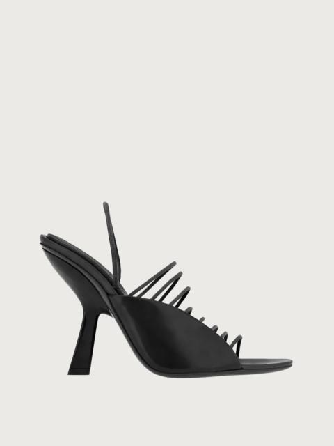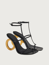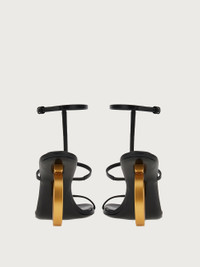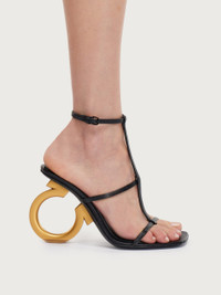 New minimal sandals with a nappa leather upper featuring thin ribbons crafted using the “book” technique. The sculptural heel features the Gancini silhouette, with a golden finish and a super-stable construction. Elasticated side insert and partially padded insole for maximum comfort. - Composition: nappa - Made in ITALY - Product code: 01E988 760226