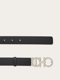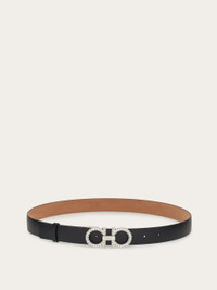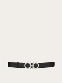 The perfect plus one for special occasions and elegant soirees, this belt in supple calfskin leather presents the signature Gancini buckle embellished with crystal studs for a touch of sparkle. The palladium-tone logo plaque adds an unmistakable finishing touch. The adjustable length allows for a more personalized fit and style. We invite you to check our size guide for more information. - height 0.9 IN - Composition: calfskin - Made in ITALY - Product code: 23B727 717550