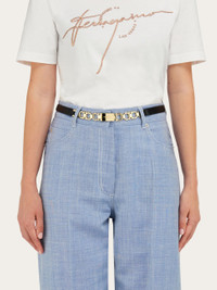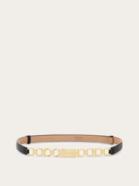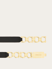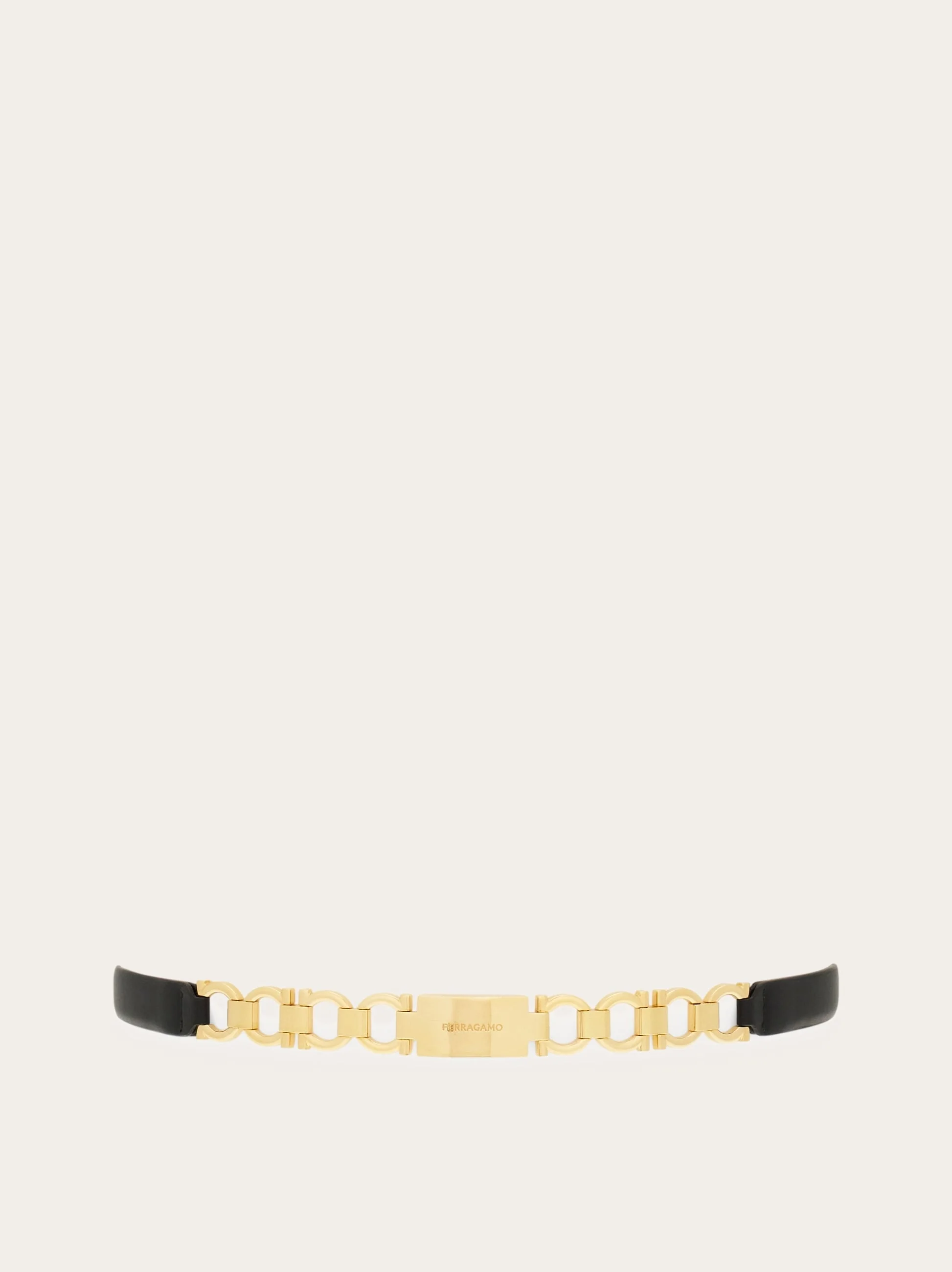 A golden chain of Gancini links adds a striking twist to this Ferragamo belt, with rectangular central buckle. The juxtaposition of calfskin leather and golden metal ensures a sophisticated look with a unique appeal. - height 0.7 IN - Composition: calfskin - Made in ITALY - Product code: 230363 780514