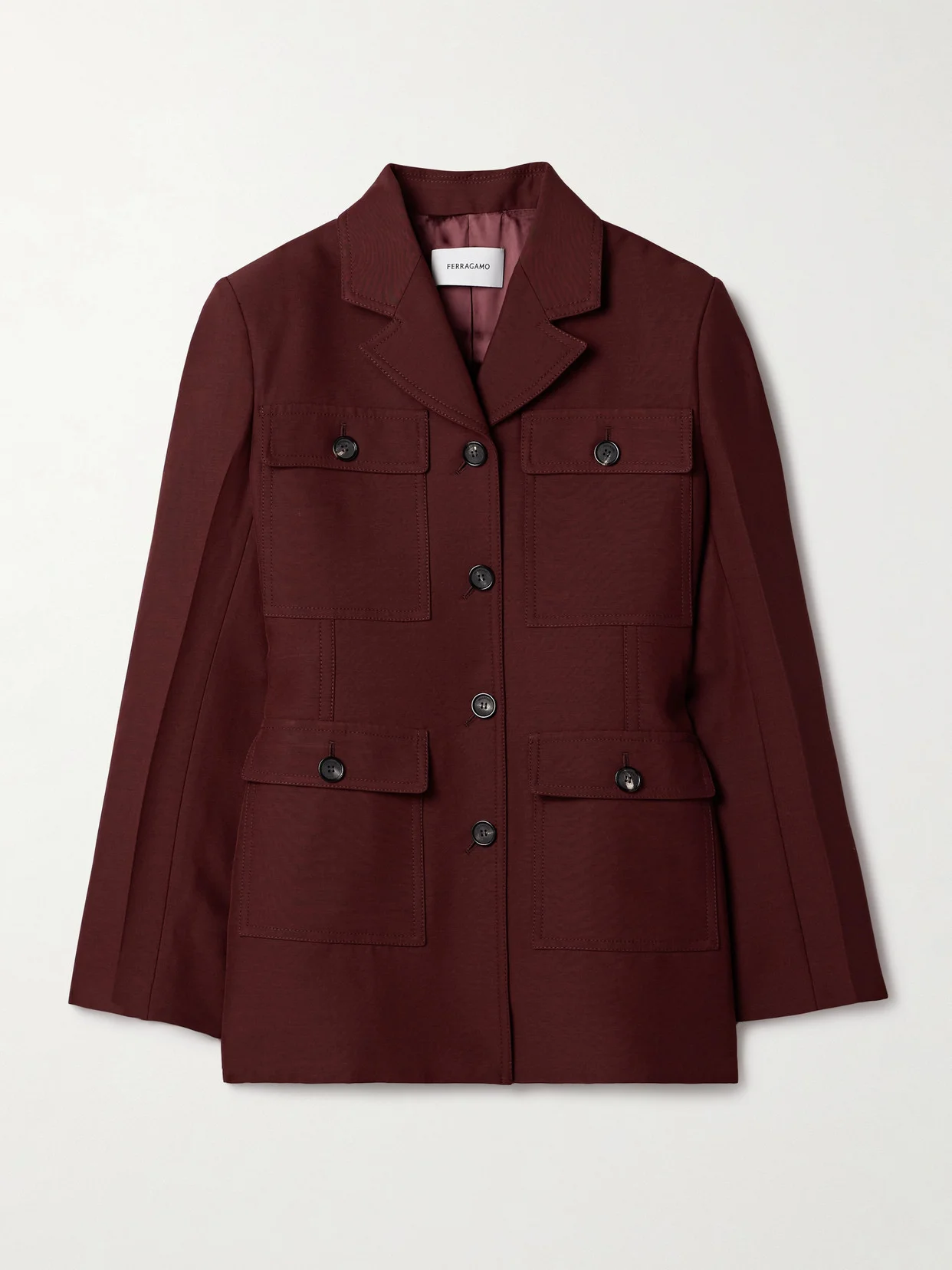 Ferragamo's blazer is designed with four button-fastening flap pockets that give the smart design a cool, utilitarian element. Tailored in Italy from burgundy faille, it has angular padded shoulders, streamlining vertical seams and a smooth satin lining. Complete the suit with the matching pants.