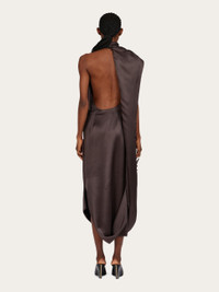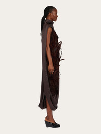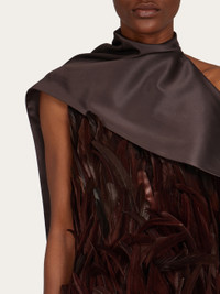 Embellished with grouse feathers, hand sewn onto the fabric base in Italy, this evening dress by Maximilian Davis is a work of wearable art. The wide sash wraps the neck and gracefully drapes along the left side framing the satin structure. The upward direction of the feathers speaks volumes about this season’s collection, whispering something the wearer will surely enjoy: expect the unexpected. - Composition: 100% viscose and feathers - Made in ITALY - Product code: 13H681 788358