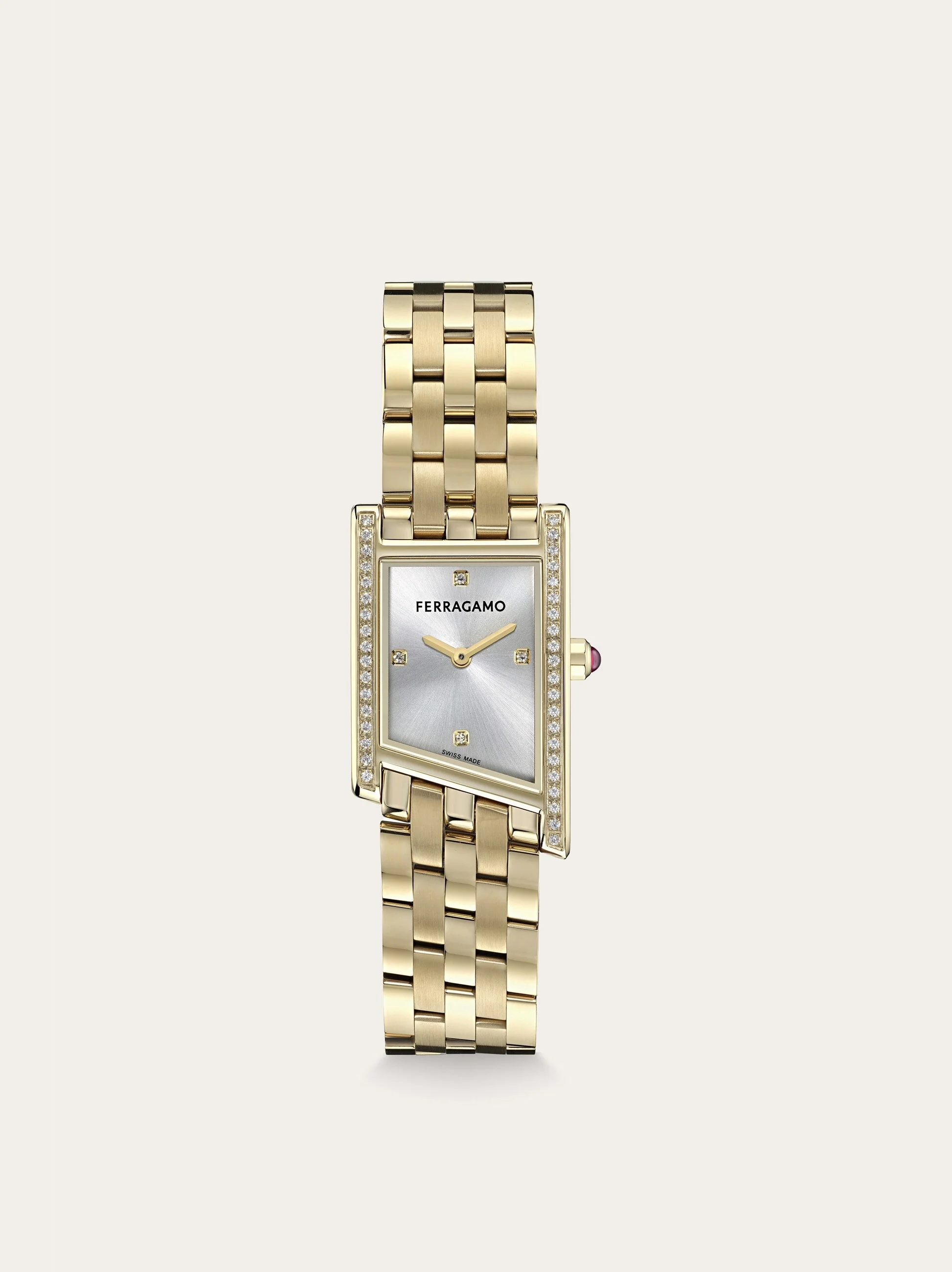 Ferragamo announces the launch of the Ferragamo Asymetrique watch, a striking example of elegance and modernity that redefines the concept of contemporary timepieces. Envisioned by Creative Director Maximilian Davis, this new icon stands out with its daring and unexpected profiles, featuring an asymmetrical tank-shaped case that captures the essence of everyday sophistication. Size: 22.4X36.71 mm Movement: RONDA 762E.2-2 hands quartz Case: IP Yellow Gold with diamonds - Crown with red cabochon Dial: White silver sunray with 42 diamonds (0.03ct) indexes Bracelet: Yellow Gold bracelet - Butterfly buckle with Ferragamo logo Glass: Sapphire crystal, anti-reflection, scratch-resistant WaterResistance: 30 meters 2+2 Year Warranty Outer box, packaging, warranty and instruction booklet - Composition: IP Yellow Gold Case and Bracelet - Made in SWISS - Product code: 611326 784357