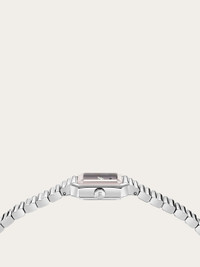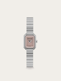 Ferragamo Crystal Petite captures the essence of refined, magnetic luxury, balancing retro charm with impeccable craftsmanship. The rectangular case reimagines the Ferragamo Crystal design in a miniature iteration - conceived as a true wrist jewel. Size: 15 X 20mm Movement: RONDA 1042 - 2 hands quartz Case: Stainless Steel Dial: Pink enamel Bracelet: Stainless steel bracelet - Butterfly buckle with Ferragamo logo Glass: Sapphire crystal, anti-reflection, scratch-resistant WaterResistance: 30meters 2+2 Year Warranty Outer box, packaging, warranty and instruction booklet - Composition: Stainless steel case and bracelet - Made in SWISS - Product code: 611332 789296