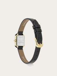 Ferragamo Crystal Petite captures the essence of refined, magnetic luxury, balancing retro charm with impeccable craftsmanship. The rectangular case reimagines the Ferragamo Crystal design in a miniature iteration - conceived as a true wrist jewel. Size: 15 X 20mm Movement: RONDA 1042 - 2 hands quartz Case: IP Yellow Gold Dial: Black enamel Bracelet: Black Karung leather Ardillon buckle Ferragamo logo Glass: Sapphire crystal, anti-reflection, scratch-resistant WaterResistance: 30meters 2+2 Year Warranty Outer box, packaging, warranty and instruction booklet - Composition: Stainless steel case and leather strap - Made in SWISS - Product code: 611331 789294