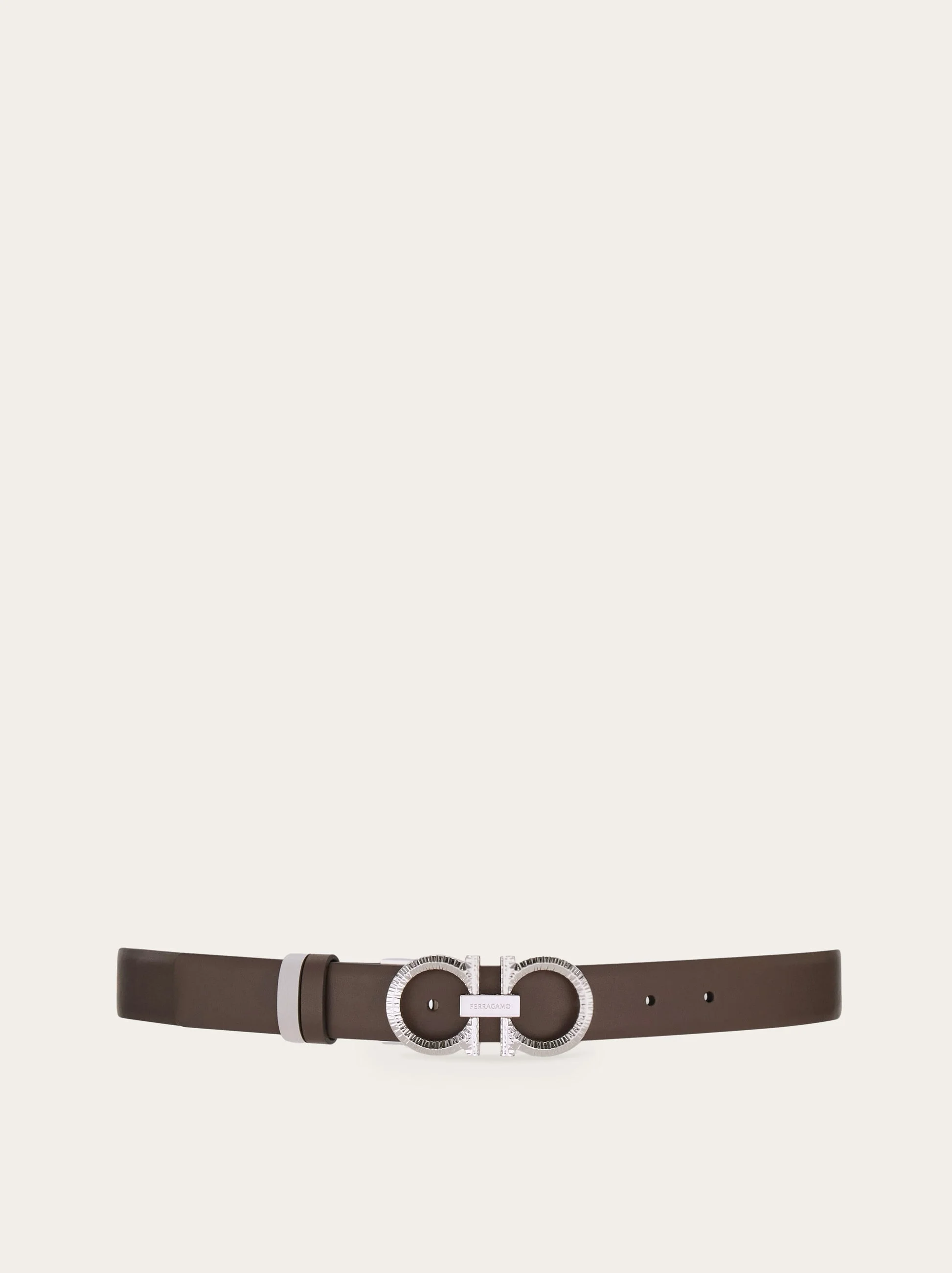 A cool evolution of the brand’s most iconic belt, featuring a reversible two-tone design for customizable styling. The Gancini-adorned buckle showcases a distinctive hammered texture with a palladium finish. With a 2.5 cm width, it adds an extra touch of femininity. The adjustable length allows for a more personalized fit and style. We invite you to check our size guide for more information. - height 0.9 IN - Composition: calfskin - Made in ITALY - Product code: 230419 786303