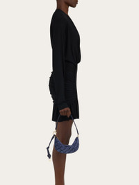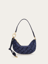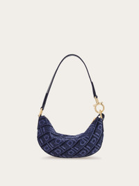 A perfect balance of glamour and iconic detailing: a new crescent-shaped mini bag with a soft velvet frame embellished with the Ferragamo monogram. The long drawstring can be used to extend the shoulder strap or as a decorative element. - height 4.5 IN length 9.6 IN width 1.7 IN - Composition: fabric - 1 compartment - Made in ITALY - Product code: 220872 779294