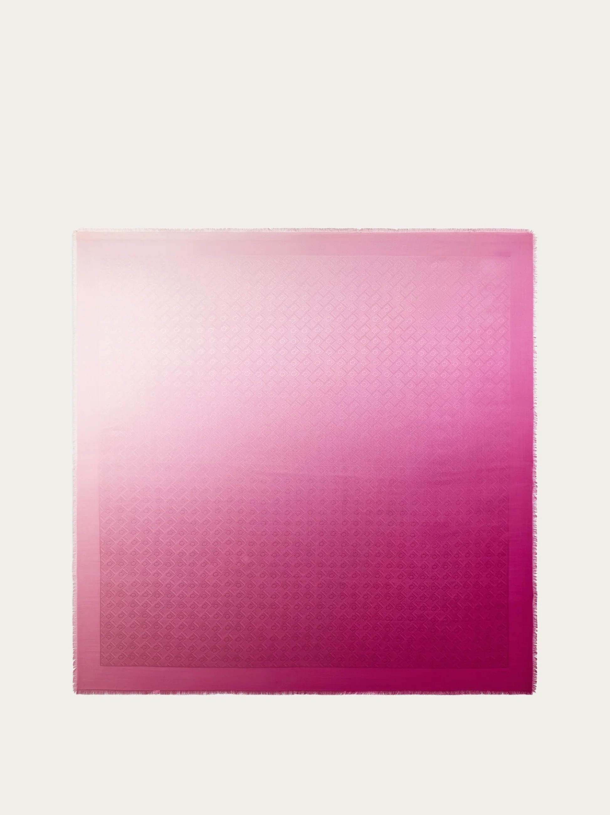 Delicate shades and total icons: this generously-sized shawl is made of a wool-silk jacquard blend with a Ferragamo monogram pattern. The delicate degrade effect adds a sophisticated color detail with exclusive elegance. - length 55.1 IN width 55.1 IN - Composition: 75% silk and 25% wool - Made in ITALY - Product code: 320960 779306