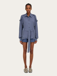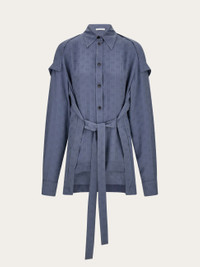 Foulard-inspired silk shirt with a truly unique silhouette. With an all-over Ferragamo Monogram, the pure silk silhouette features a yoke-effect back panel that hugs the shoulders and hips, with open edges. The side sash can be tied at the front or back for versatile styling. This garment is made entirely of organic silk. - Composition: 100% organic silk - Model measurements: Height 5' 9"/175 cm; Bust 30"/76 cm; Waist 24"/61 cm; Hips 34½"/87 cm - Model wearing: 38/XS - Made in ITALY - Product code: 13H313 785406