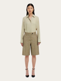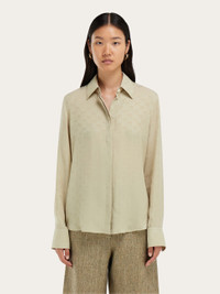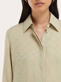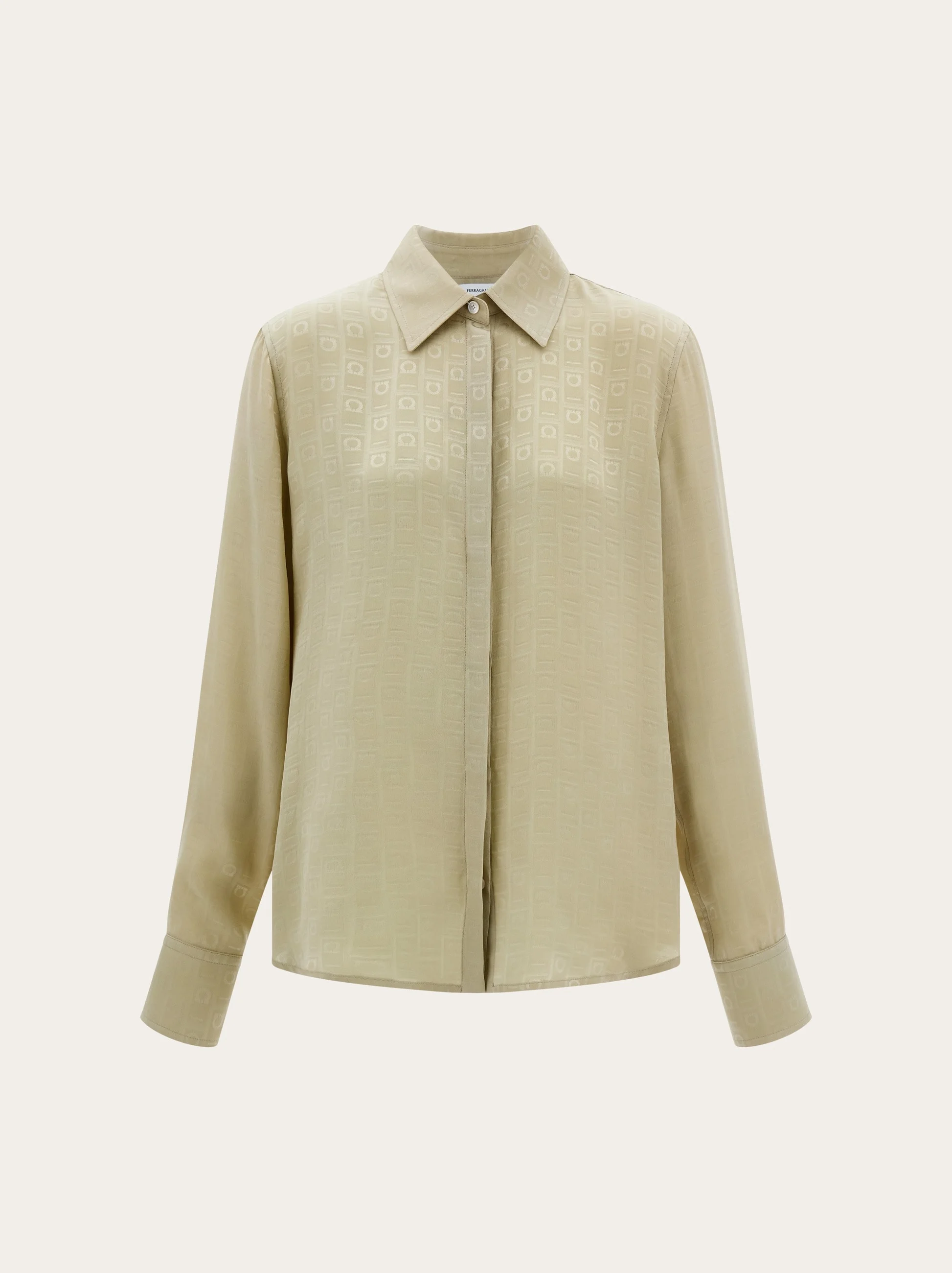 Luxurious silk shirt featuring the all over Ferragamo monogram print. This classic cut shirt has soft sleeves with dropped shoulders and button up cuffs that cinch the silhouette. The bottom hem is straight at the front, and rounded at the back, and the covered placket reveals just a single button below the collar. - Composition: 100% silk - Made in ITALY - Product code: 13G779 791347
