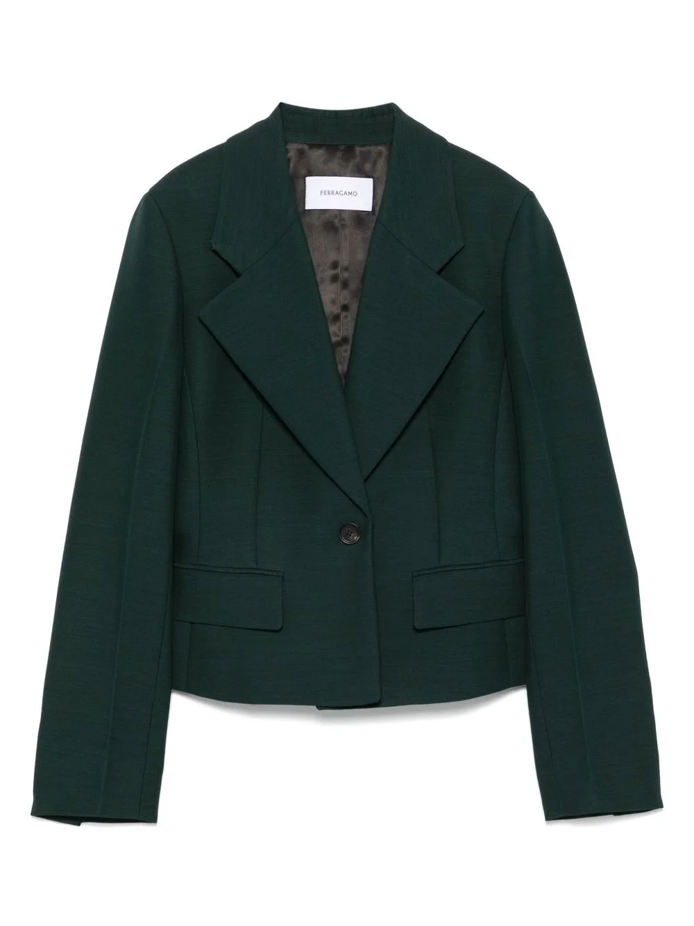 single-breasted blazer Highlights - Moss green - Front button fastening - Long sleeves - Two side flap pockets - Cropped Made in Italy Composition Lining: Viscose 100% Outer: Viscose 73%, Wool 27% SIZE & FIT Model measurements Height 5 ft 10 in(1.78 m) Bust/Chest 31.49 in(80 cm) Hips 37 in(94 cm) Waist 23.62 in(60 cm) FittingInformation Designed for a slim fit that sits just away from the body offering a close yet comfortable fit The internal shoulder pads offer a structured shape Made from a midweight non-stretch fabric, this piece offers minimal elasticity when worn
