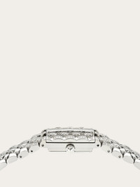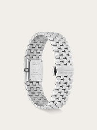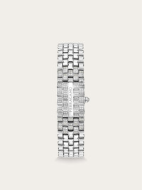 The Ferragamo Secret watch unveils its precious edition as a unique jewel. Crafted with artisanal charm, technical innovation, and aesthetic sophistication, it combines the functionality of an exceptional watch with the elegance of a luxurious accessory. At first glance, it appears as a bracelet, but with a gentle press on the top panel, it reveals a dial adorned with precious stones and sparkling diamonds. Size: 18.5 x 30 mm Movement: RONDA 1032 - 2 hands quartz Case: Stainless steel with secret panel and 104 diamonds (0,42 ct) Dial: White mother of pearl with metal studs Bracelet: Stainless steel bracelet with 84 diamonds (0,42ct) - Butterfly buckle with Ferragamo logo Glass: Sapphire crystal anti-reflection, scratch-resistant WaterResistance: 30 meters 2+2 Year Warranty Outer box, packaging, warranty and instruction booklet - Composition: Stainless steel case and bracelet/Mother of pearl and diamonds - Customisation available in store only - Made in SWISS - Product code: 611296 778117