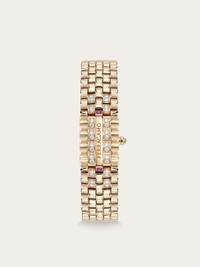 The Ferragamo Secret watch unveils its precious edition as a unique jewel. Crafted with artisanal charm, technical innovation, and aesthetic sophistication, it combines the functionality of an exceptional watch with the elegance of a luxurious accessory. At first glance, it appears as a bracelet, but with a gentle press on the top panel, it reveals a dial adorned with precious stones and sparkling diamonds. Size: 18.5 x 30 mm Movement: RONDA 1032 - 2 hands quartz Case: IP rose gold with secret panel and 16 diamonds (0.48ct) Dial: Red agate with metal stud indexes Bracelet: IP rose gold bracelet with 2 rubies (2mm) and 16 diamonds (2mm - 0.48ct) - Butterfly buckle with Ferragamo logo Glass: Sapphire crystal, anti-reflection, scratch-resistant WaterResistance: 30 meters 2+2 Year Warranty Outer box, packaging, warranty and instruction booklet - Composition: Stainless steel and IP rose gold case and bracelet/Agate, rubies and diamonds - Customisation available in store only - Made in SWISS - Product code: 611296 778116