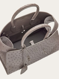 Coveted for its unique texture, the quilled and smooth texture of pure ostrich leather of this Hug bag is laminated for a super luxurious finish. Perfect to add a glamorous finish to any look, this supple yet resistant accessory has covered top handles, a palladium toned Gancio slider clasp, and a lined interior with flat pocket. Adjustable shoulder strap. - A) Height 8.6 IN B) Length 12.4 IN C) Width 7.4 IN - Composition: laminated ostrich - Handle drop: 5.5 in/14 cm - Medium - Made in ITALY - Product code: 219199 776928