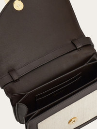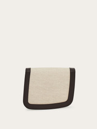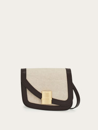 A savvy contrast of texture and color highlights the artisanal skill used to create this summer iteration of the Ferragamo Fiamma bag. Made of calfskin with cotton and linen canvas quadrants, it has an asymmetric front flap that is fastened by an iconic clasp with visible stitching around the edges and a spacious, lined interior with flat pocket and slots for cards and documents. Adjustable shoulder strap. - Shoulder strap length: 55 cm - Composition: fabric and leather - Product code: 218968 773222 - Made in ITALY