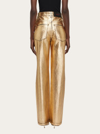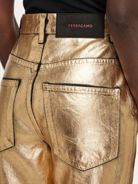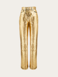 Invest in a pair of Ferragamo jeans for a contemporary five pocket trouser that is always modern and classic. This high glam take on a street style classic in a golden hue has a high waist, and slightly flared leg. Classic features include contrasting stitching, custom metal buttons and the waist and rounded pockets on the front. - Composition: 100% cotton - Product code: 13C990 771353 - Made in ITALY