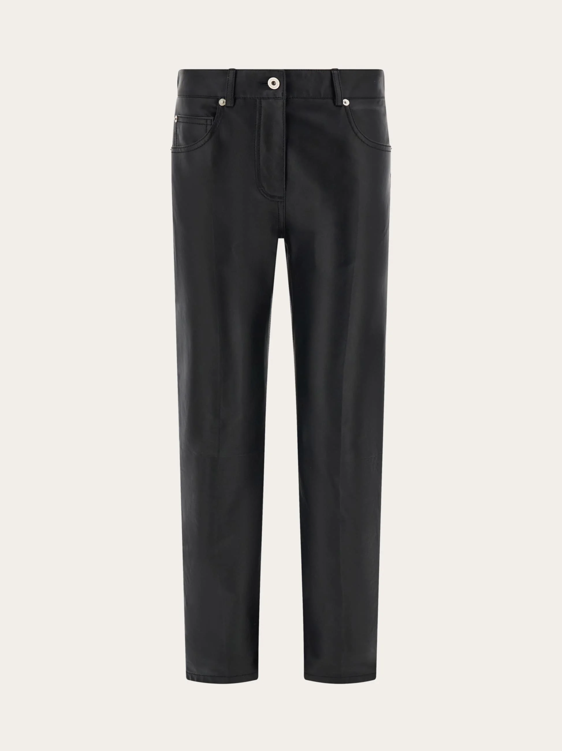 Soft and smooth with a silky handfeel, these new five pocket trousers are cut from plonge nappa. The mid-rise waist, straight leg and custom buttons and rivets echo a rock feel, punctuated by applied back pockets and an embossed tonal tab at the back of the waist. - Composition: nappa - Made in ITALY - Product code: 13H360 788361