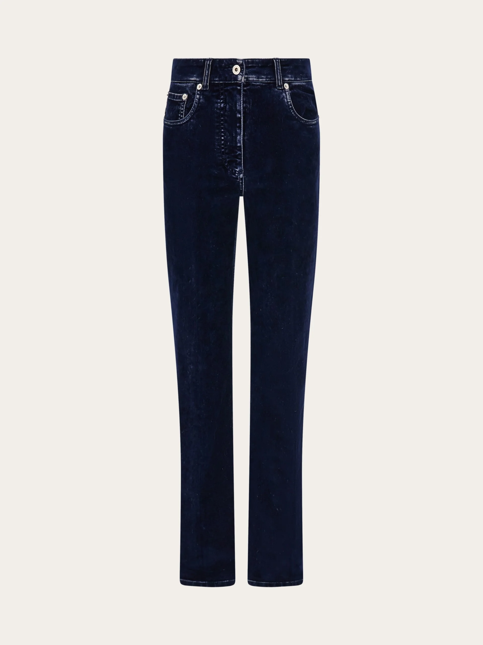 Soft, flocked cotton gives this garment dyed five pocket trouser an almost velvety feel. The straight fit is expertly cut according to the textbook denim details: custom doughnut buttons and rivets, with tonal stitching and a suede logo tab at the back. - Composition: 76% cotton, 22% viscose, 2% elastane - Made in ITALY - Product code: 13G444 791500