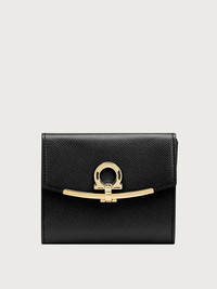A harmonious blend of femininity with practicality comes together in this timeless design. Compact wallet in hammered calfskin with a golden Gancini on the front. The interior has a double compartment for banknotes and slots for credit cards. The front pocket with zip closure, is perfect for coins. - Composition: Hammered calf leather - Made In ITALY