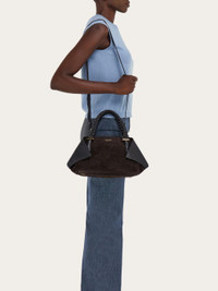 Ferragamo introduce a brand new silhouette: the Scarf bag. With its natural sophistication, this compact edition is cut from smooth calfskin leather which billows at the sides like soft fabric, while the braided, mid-length top handle echoes the Brand’s artisanal flair. A double slider zip opens to reveal a spacious lined interior with zip pocket, and custom metal studs which protect the base. - A) Height 8.2 IN B) Length 14.1 IN C) Width 5.9 IN - Composition: calfskin suede - Handle drop: 5.5 in/14 cm - Medium - Made in ITALY - Product code: 219865 789526