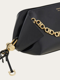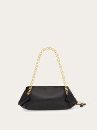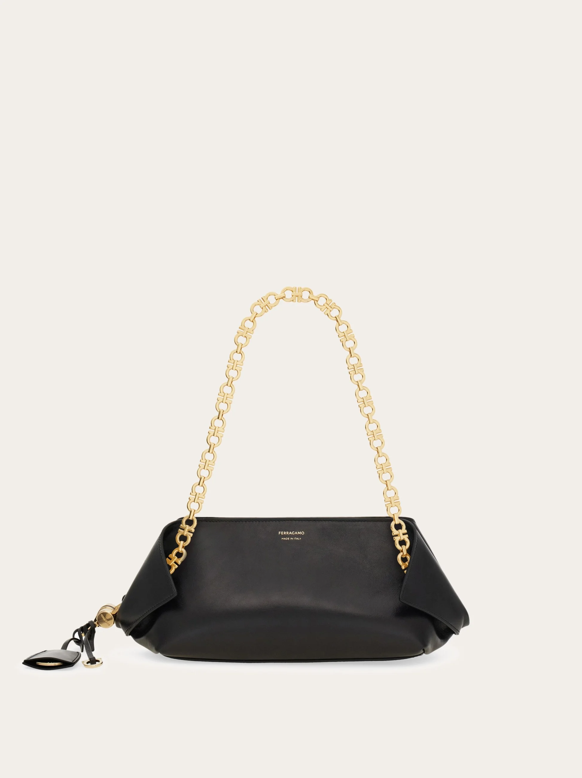 A captivating shape with sophisticated details: introducing the new Ferragamo shoulder bag. The folded corners enhance the soft, fluid feel of the calfskin leather, complemented by the glam glow of the golden hardware. A double slider zip opens to reveal a spacious lined interior with zip pocket. Detailed with small custom charm and covered key fob. - A) Height 5.5 IN B) Length 10.2 IN C) Width 5.1 IN - Composition: calfskin - Small - Made in ITALY - Product code: 21A371 787861