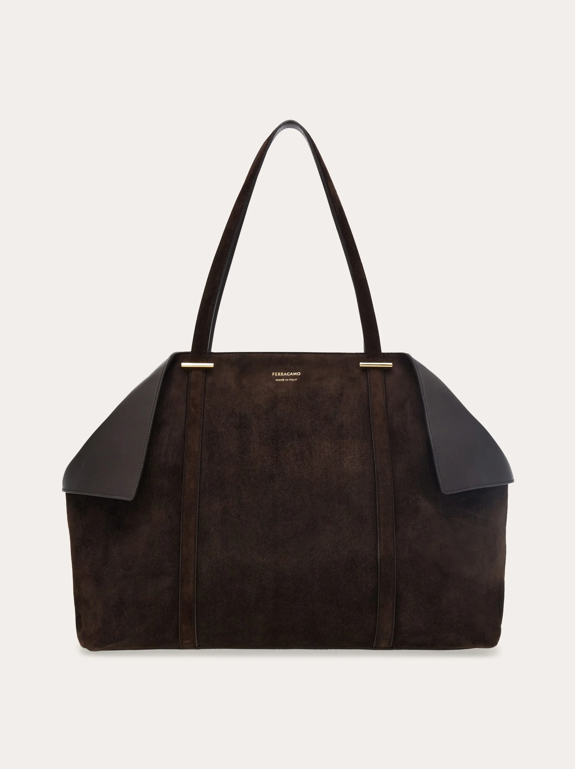 A distinguished edition of the Ferragamo tote, in delicious calfskin suede. The leather lining that peeps out from the side folds enhances the rich feel of the fabric, ideal to elevate everyday looks. The leather top handles extend along the front panels, punctuated by a simple rectangular golden clasp. A an embossed logo on the front panel completes the design of this ergonomic hold all that wraps the body perfectly as you move. - A) Height 11.8 IN B) Length 14.9 IN C) Width 7.0 IN - Composition: calfskin suede - Handle drop: 9.8 in/25 cm - Large - Made in ITALY - Product code: 21A452 789602
