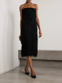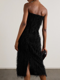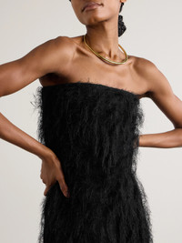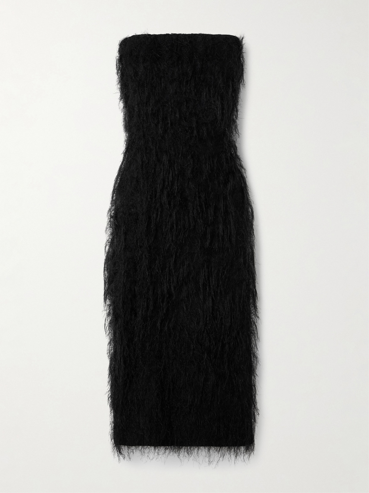 Ferragamo's experimentation with fabrics puts a playful spin on the classic little black dress. This one is cut from voile with a strapless neckline and is covered with wispy fringing. Wear yours with a diamond-dusted necklace.