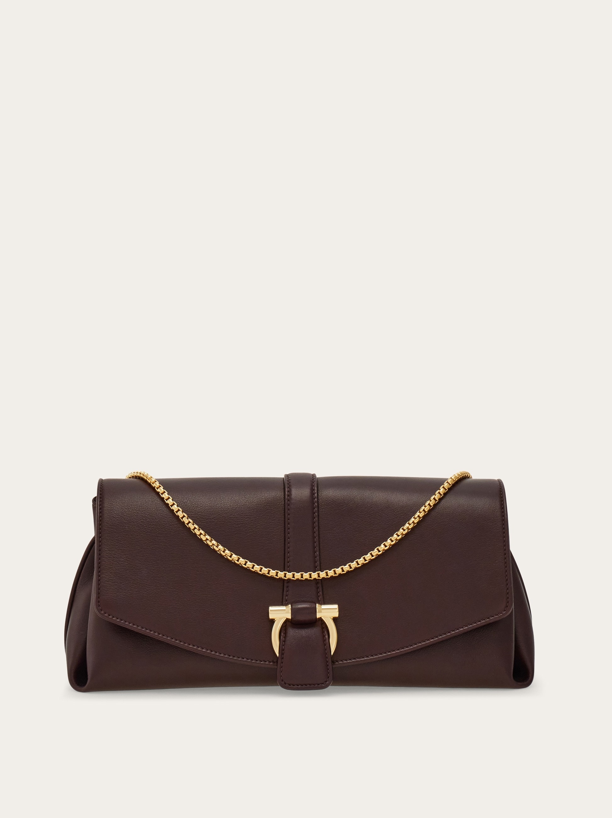 Effortlessly chic and easy to carry, this new Ferragamo cross body is a lesson in contemporary style. Cut from sumptuous Italian calfskin with a semi-gloss finish, the leather is punctuated by a golden Gancini clasp on the front flap. At the sides, custom golden tabs shape the bellows whose outline echoes the lily, the symbol of Florence. Carry as a clutch, shoulder bag or wear cross body with the adjustable, removable strap and golden chain. - A) Height 6.2 IN B) Length 12.2 IN C) Width 4.3 IN - Composition: calfskin - Small - Made in ITALY - Product code: 219794 777232