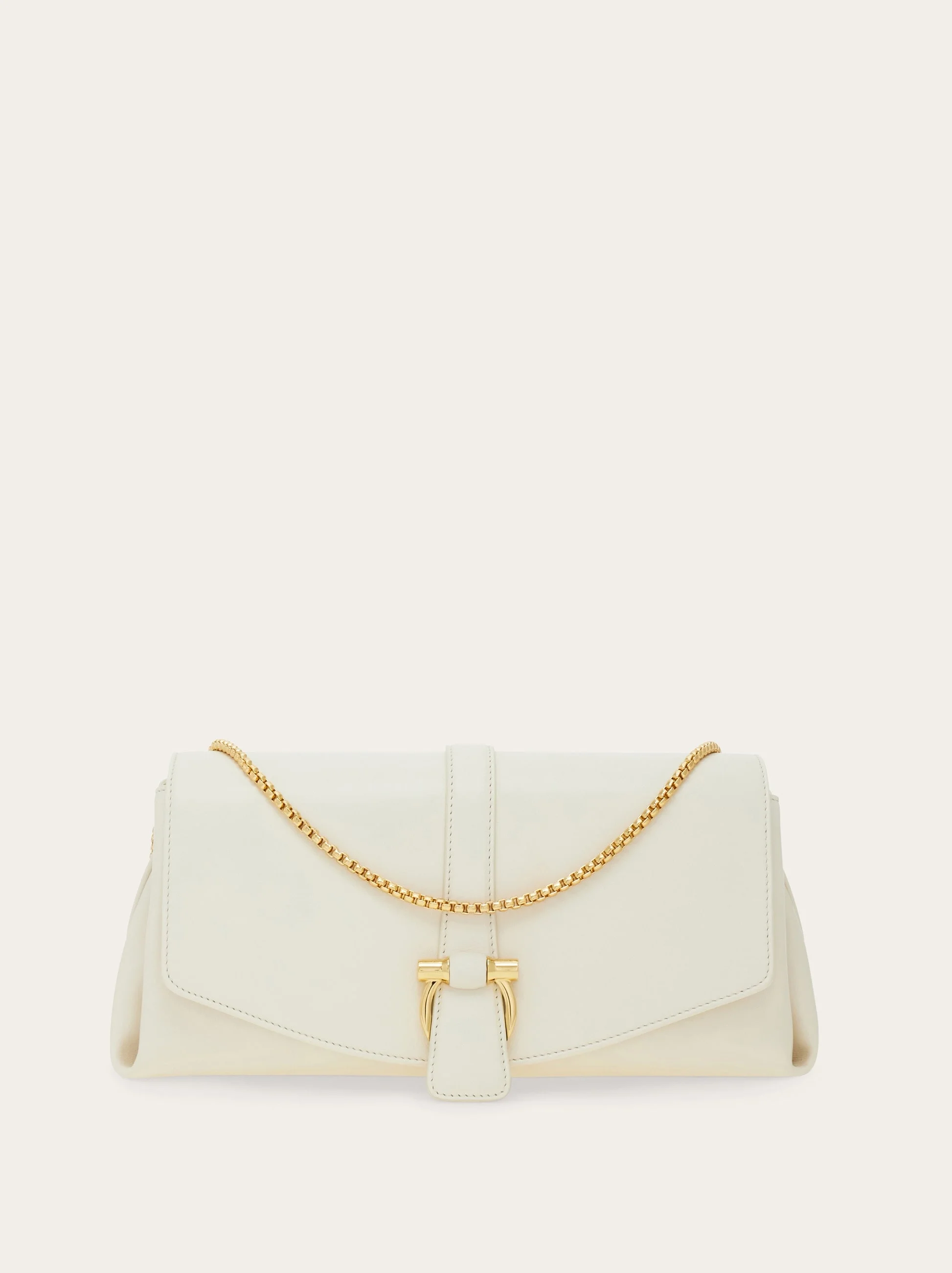 Effortlessly chic and easy to carry, this new Ferragamo cross body is a lesson in contemporary style. Cut from sumptuous Italian calfskin with a semi-gloss finish, the leather is punctuated by a golden Gancini clasp on the front flap. At the sides, custom golden tabs shape the bellows whose outline echoes the lily, the symbol of Florence. Carry as a clutch, shoulder bag or wear cross body with the adjustable, removable strap and golden chain. - A) Height 6.2 IN B) Length 12.2 IN C) Width 4.3 IN - Composition: calfskin - Small - Made in ITALY - Product code: 219794 789501