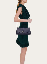 Sumptuous folds and rich calfskin leather characterize this new cross body bag by Ferragamo. Punctuated by a golden Gancini clasp on the front flap, and golden tabs that gather the side bellows, it can be carried as a clutch, worn cross body or over the shoulder via the interchangeable leather and metallic straps. - A) Height 6.2 IN B) Length 12.2 IN C) Width 4.3 IN - Composition: calfskin - Small - Made in ITALY - Product code: 219794 785171