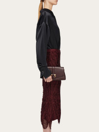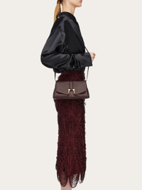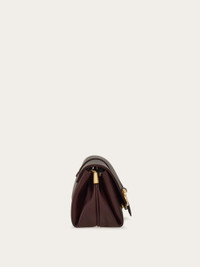 Compact, chic and easy to carry, this new Ferragamo cross body is a lesson in contemporary style. Cut from sumptuous Italian calfskin with a semi-gloss finish, the leather is punctuated by a golden Gancini clasp on the front flap. At the sides, custom golden tabs shape the bellows whose outline echoes the lily, the symbol of Florence. Carry as a clutch, shoulder bag or wear cross body with the adjustable, removable strap and golden chain. - A) Height 5.5 IN B) Length 10.2 IN C) Width 3.9 IN - Composition: calfskin - Extra Small - Made in ITALY - Product code: 219795 777237