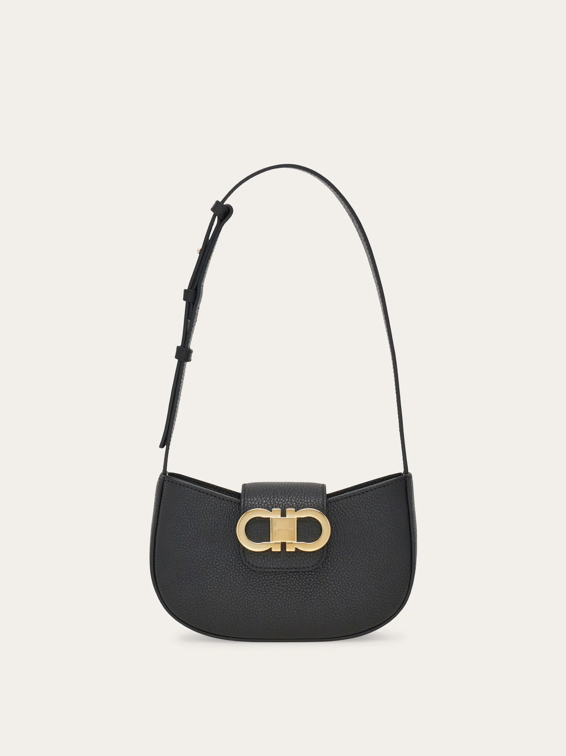 Effortless elegance in a compact form, this new mini bag showcases gently rounded edges, a zip closure, and a top bridge accented with a signature Gancini detail. The leather-lined interior features dedicated slots for cards and documents, while the adjustable strap allows for refined shoulder styling. - height 4.5 IN length 7.8 IN width 2.1 IN - Composition: hammered calfskin - Mini - Made in ITALY - Product code: 220947 785940