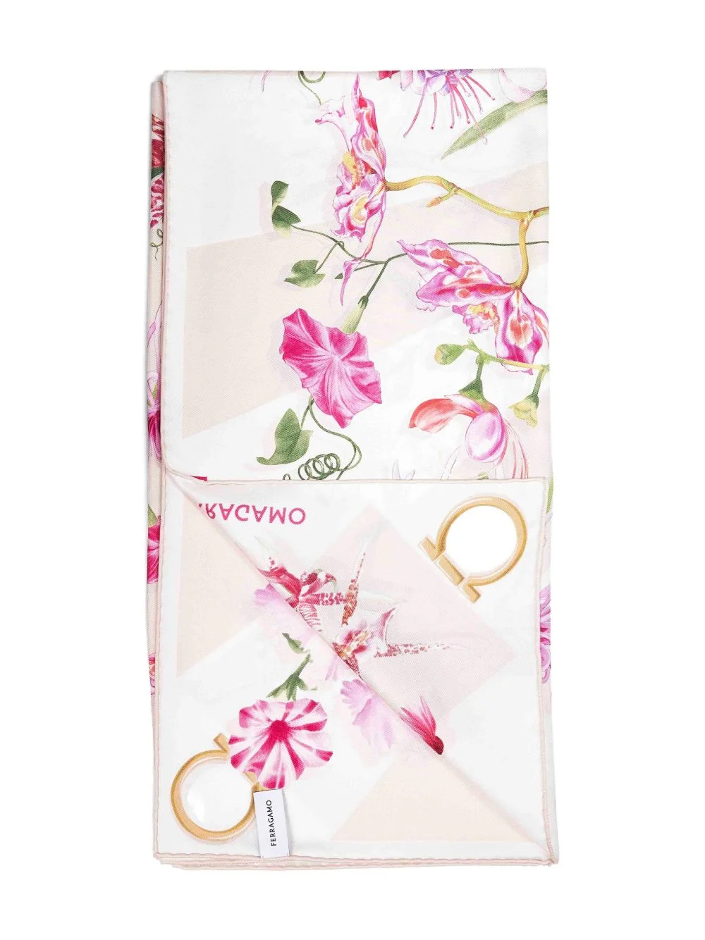 jacquard gancini floral scarf Highlights - Light ballet pink/ivory - Jacquard signature - Gancini detail - Floral print - Square Made in Italy Composition Silk 100% SIZE & FIT Measurement LENGTH 35.43 in(90 cm) WIDTH 35.43 in(90 cm)
