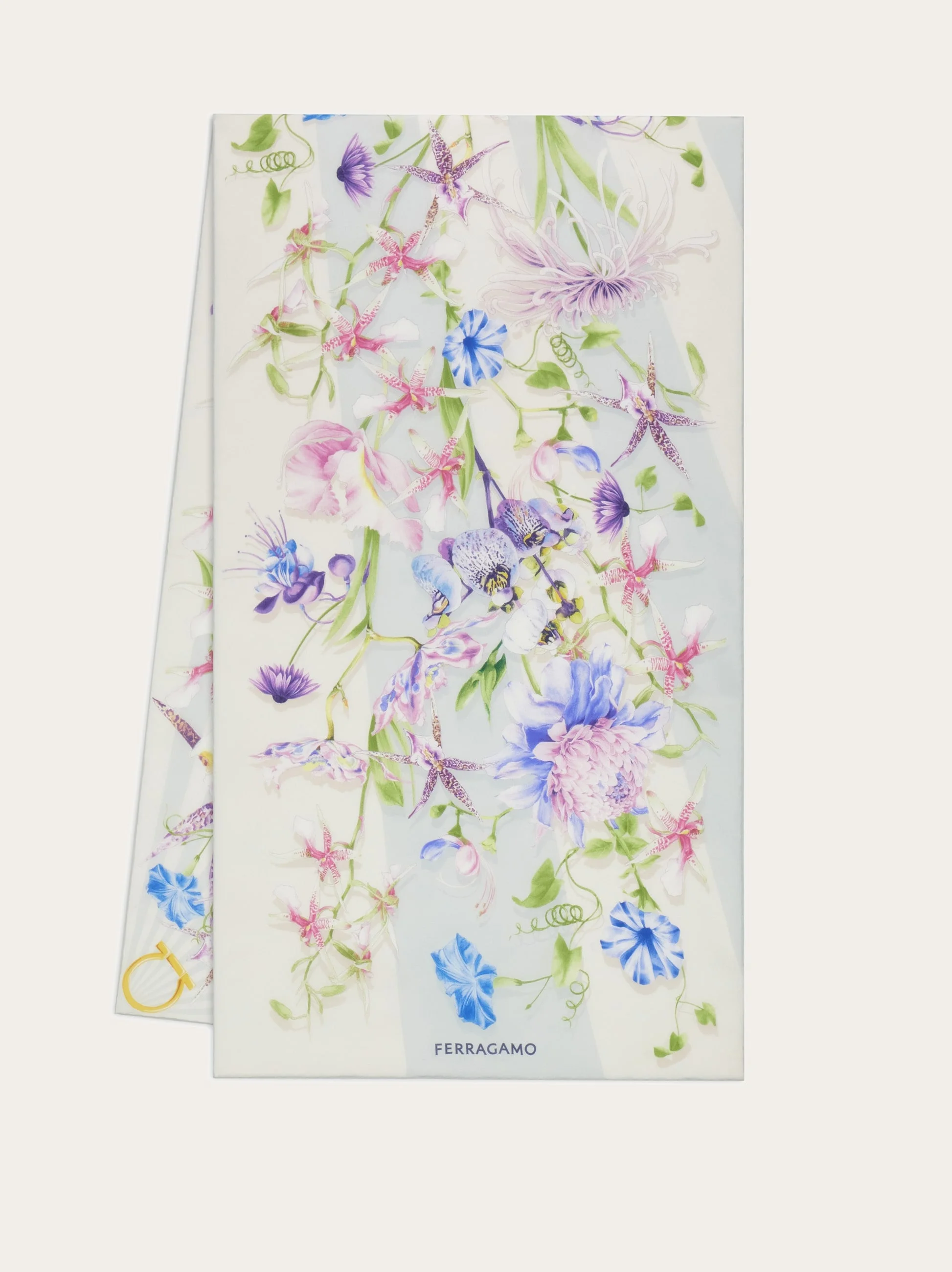 A lightweight scarf, soft enough to drape effortlessly around the neck—designed for the modern woman who embraces elegance with ease. The Gaia print is a lush floral composition, with each bloom inspired by archival designs, set against a radiant optical backdrop for a touch of graphic charm. - length 62.9 IN width 17.7 IN - Composition: 100% silk - Made in ITALY - Product code: 321243 789925