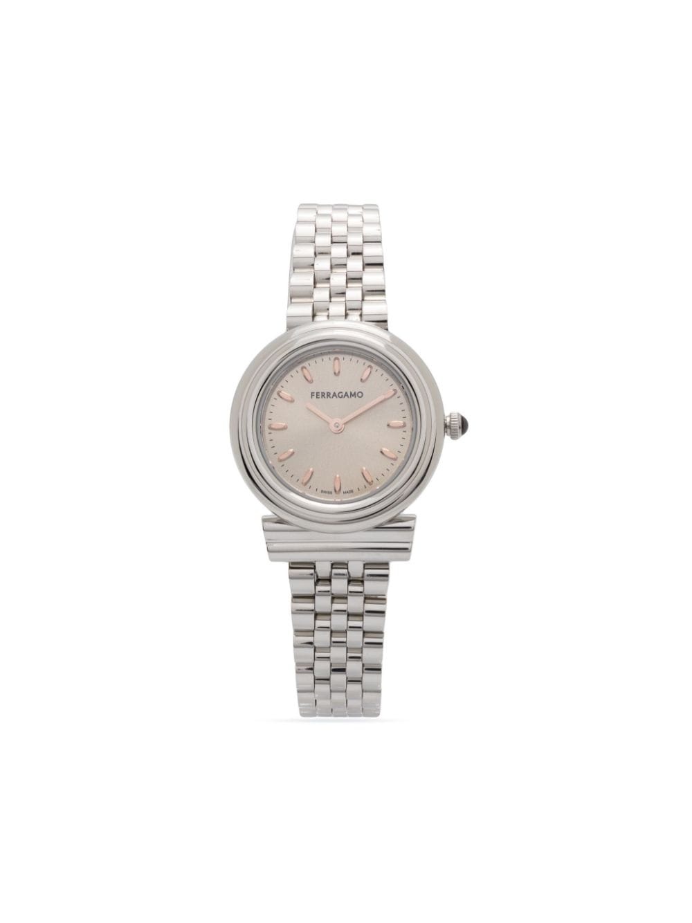 Gancini 28mm Showcasing Salvatore Ferragamo Watches' refined aesthetic, the iconic Gancini model is presented here with a silver-tone 28mm round case. The accessory is powered by quartz and comes with a sleek link bracelet. Highlights - 28mm - Stainless steel - Quartz movement - Index dial - Baton hands - Round face - Screw-down crown - Stainless steel link bracelet - Butterfly clasp fastening Imported SIZE & FIT Model measurements Height 5 ft 10 in(1.78 m) Bust/Chest 32.3 in(82 cm) Hips 35.4 in(90 cm) Waist 24.8 in(63 cm) Measurement CIRCUMFERENCE 7.8 in(19.5 cm) DIAMETER 1.1 in(3 cm) Thickness 0.3 in(0.5 cm) WIDTH 0.8 in(2 cm)