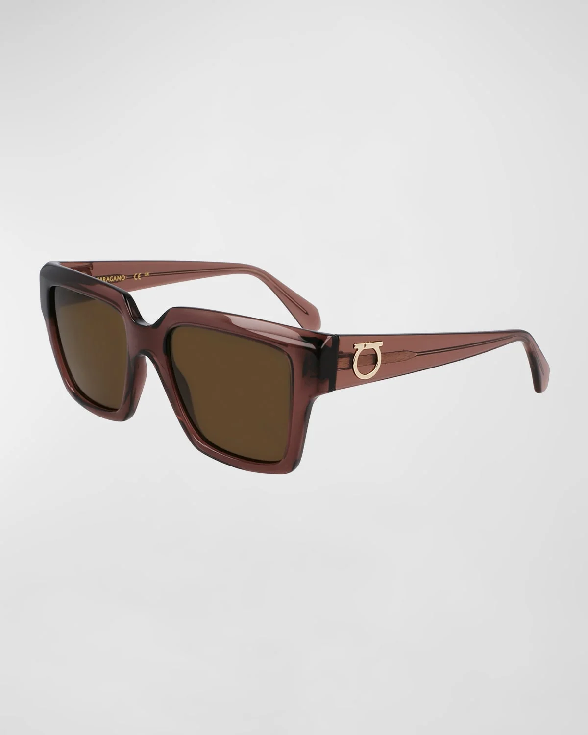 - Ferragamo beveled square sunglasses in plastic - Lens/bridge/temple (in mm): 54-19-140 - Solid lenses - Saddle nose bridge - Gancini logo on temples - Thin, tapered arms - Wipe clean - 100% UVA/UVB protection - Made in Italy - Proposition 65 warning for California residents