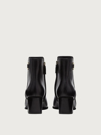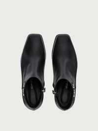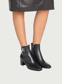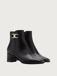 Squared elements and sophisticated style. This new bootie with a double Gancini at the ankle is sleek and stylish. The midi heel is the perfect height for all day comfort. With a calfskin upper and a layered leather and suede sole, this subtle bootie is a testament to the brand’s savoir faire. - Heel 5.5cm - Composition: Calf leather - Made In ITALY